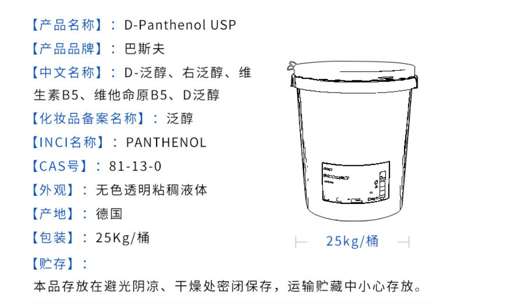 巴斯夫D-泛醇 维生素B5保湿剂护理头发D-Panthenol USP